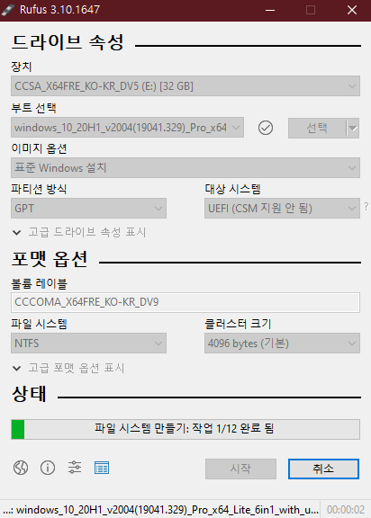 그리고 시작을 눌러 주시면 포맷 USB로 만들어지는 것이 시작이 됩니다.