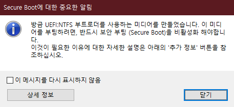 Secure boot에 대한 중요한 알림이라는 창이 하나가 나옵니다.